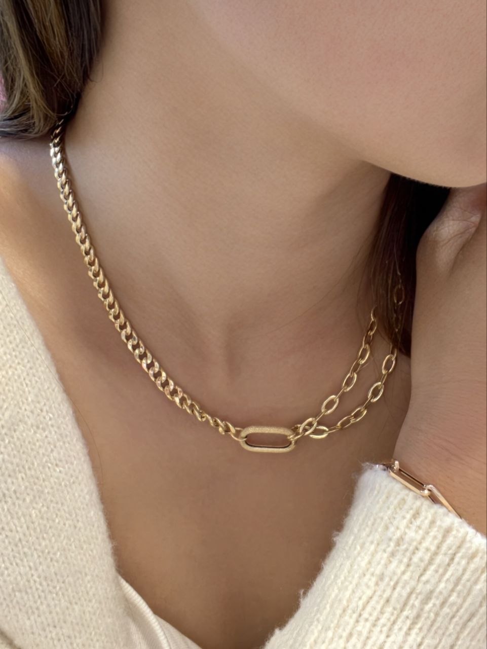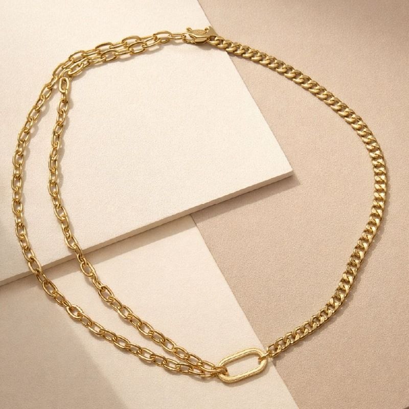 這款獨特的 18K黃金雙鏈拼接項鍊 展現了現代珠寶設計的創新與個性。項鍊巧妙地將兩種截然不同的鏈條風格——粗獷經典的古巴鏈(Cuban/Curb Chain)與簡約優雅的十字鏈(Cable Chain)——完美結合,並在中央以一個精緻的橢圓形金屬環(Oval Link)作為視覺焦點與連接點。